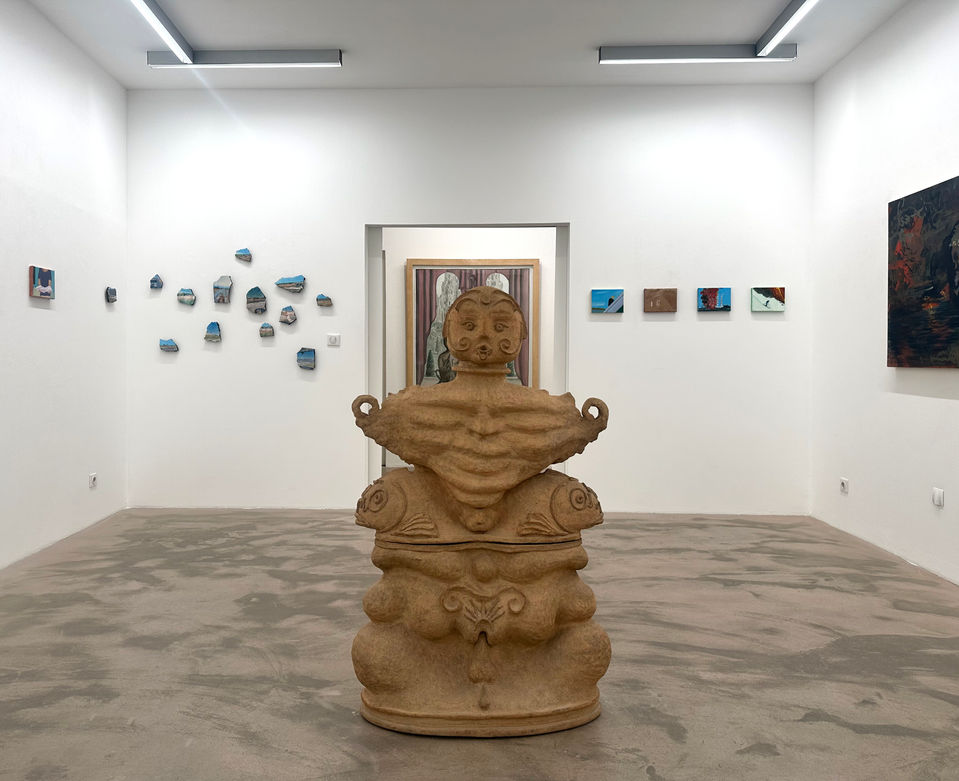 Sont également présentées, des œuvres d’Elmar Trenkwalder dont une sculpture fondatrice de son travail. Comme cela le sera ensuite dans toute son œuvre, la sculpture est ici inséparable du dessin qui anime l'ensemble des volumes. Evoquant une figure de Janus, elle est orientée à la fois vers le fond de la galerie et vers la rue, elle engage un double regard, intérieur et extérieur, et invite le spectateur à des allers-retours constants entre l’espace de l’exposition, celui des réserves de la galerie et l’espace public. La sculpture agit comme un seuil, un point de passage qui structure la circulation du regard que nous portons sur l'ensemble des œuvres.
